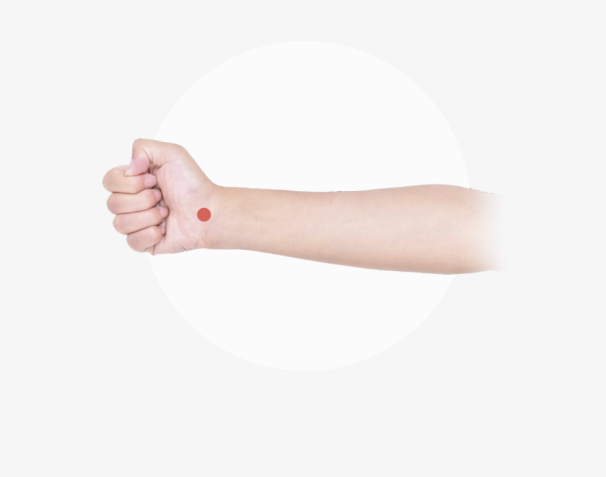 握拳屈腕,从手掌方向沿前臂内侧中线向腕部触摸,腕横纹中央的凹陷处即是大陵穴。
