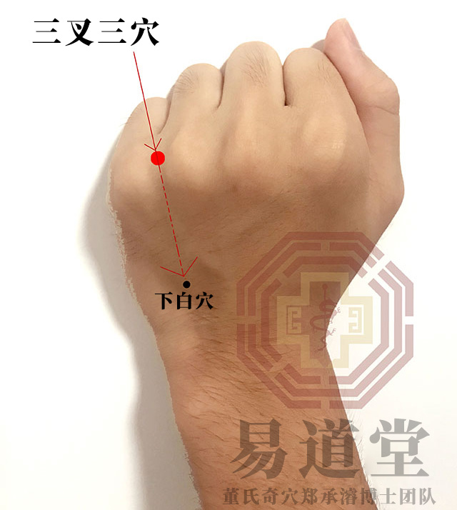 握拳取穴,在无名指与小指叉口之中央处是穴。