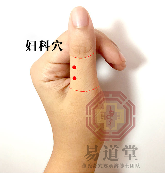 妇科穴:当大指背第一节之中央线外开三分,距前横纹三分之一处一穴、距该横纹三分之二处一穴,共二穴;贴于骨旁下针,针深二分至三分,一次两针齐下,谓之倒马针。说明:妇科穴位于大指背第一节小侧,计二穴,取穴采三分点法。