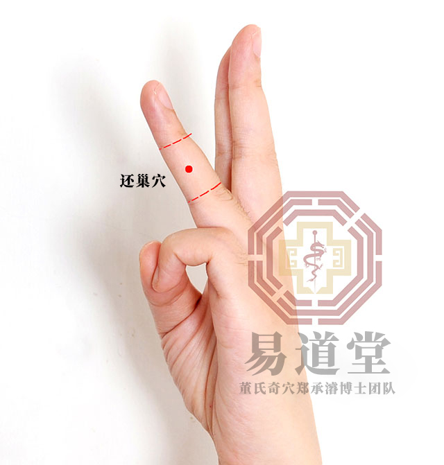 还巢穴:当无名指外侧正中央点是穴;位于阴掌无名指第二节E线上,仅一穴,取穴采二分点法,即无名指第二节靠近小指之侧黑白肉际中点。 五分针,针二至三分(原注:禁忌双手同时取穴)。
