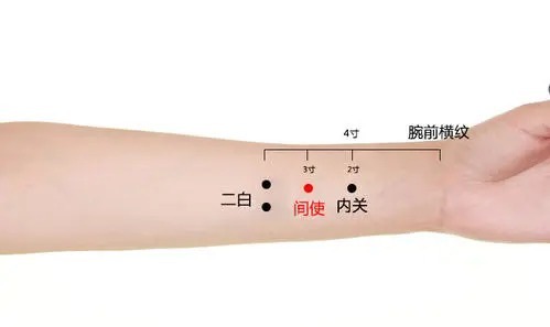 内关穴位于前臂掌侧,腕横纹上2寸,掌长肌腱与桡侧腕屈肌腱之间,间使穴则位于腕横纹上3寸,同样在掌长肌腱与桡侧腕屈肌腱之间。