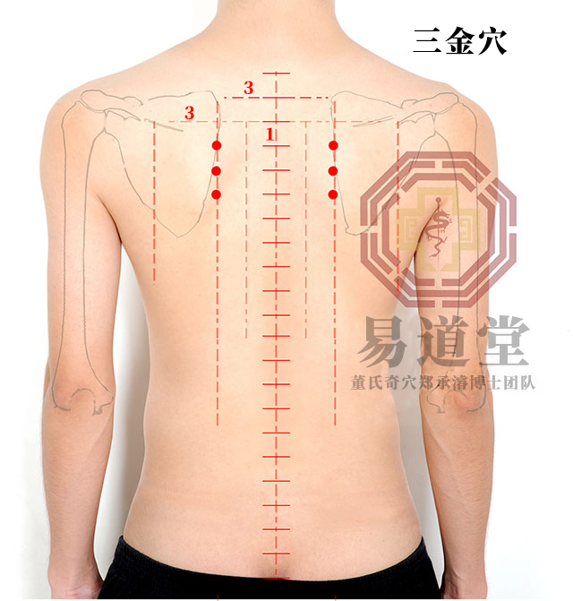 金斗、金吉、金陵三穴分别位于第三、四、五椎外开三寸处,相当于膀胱经之魄户、膏育、神堂穴,点刺出血少许。